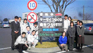 東建産業の青年部が中心となり、交通安全活動を行っています。ウッディな看板も彼らの手作りです。